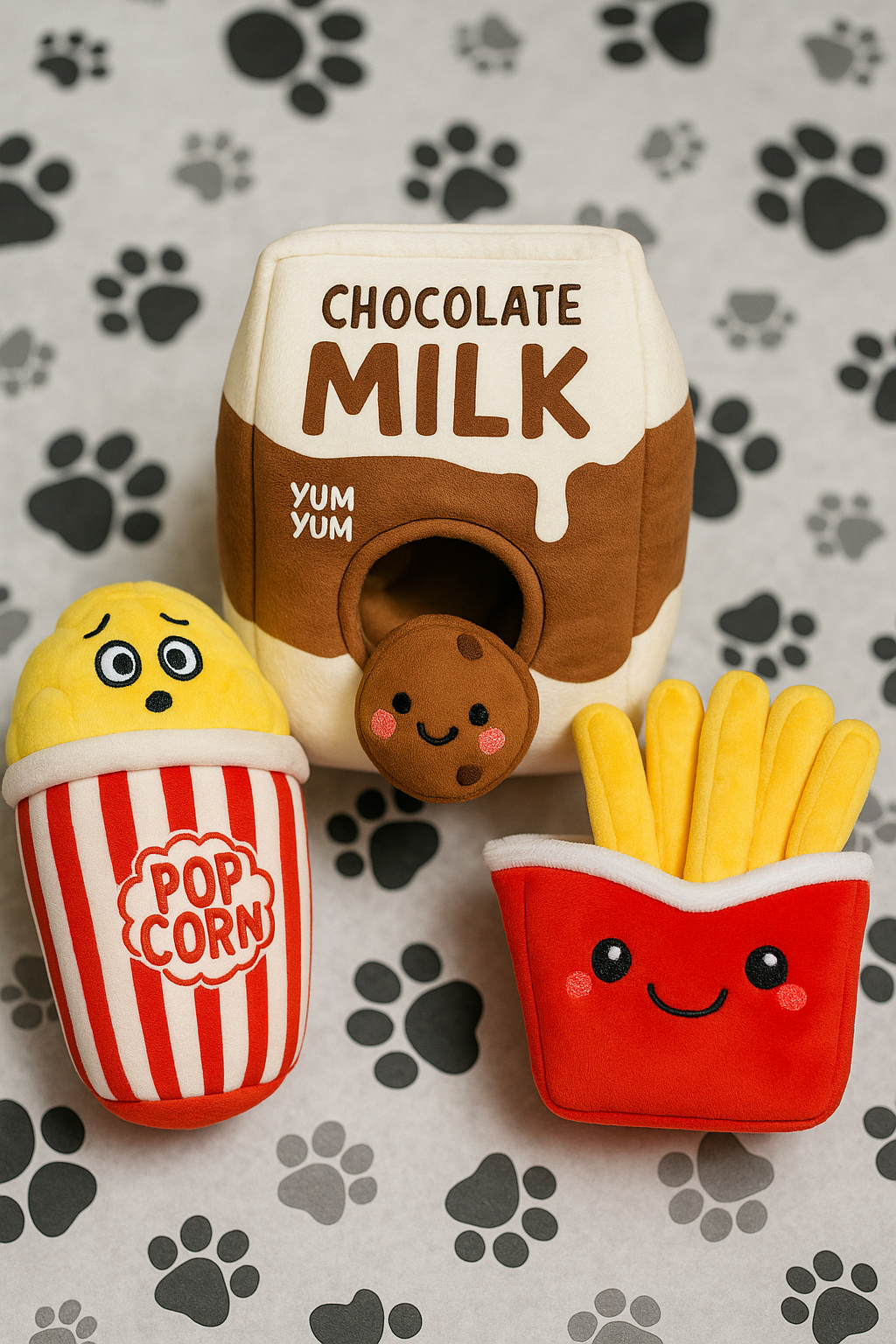 This snack-inspired toy trio is made to entertain curious noses and cute camera rolls! It’s the ideal enrichment bundle for sniffy pups and playful chewers.